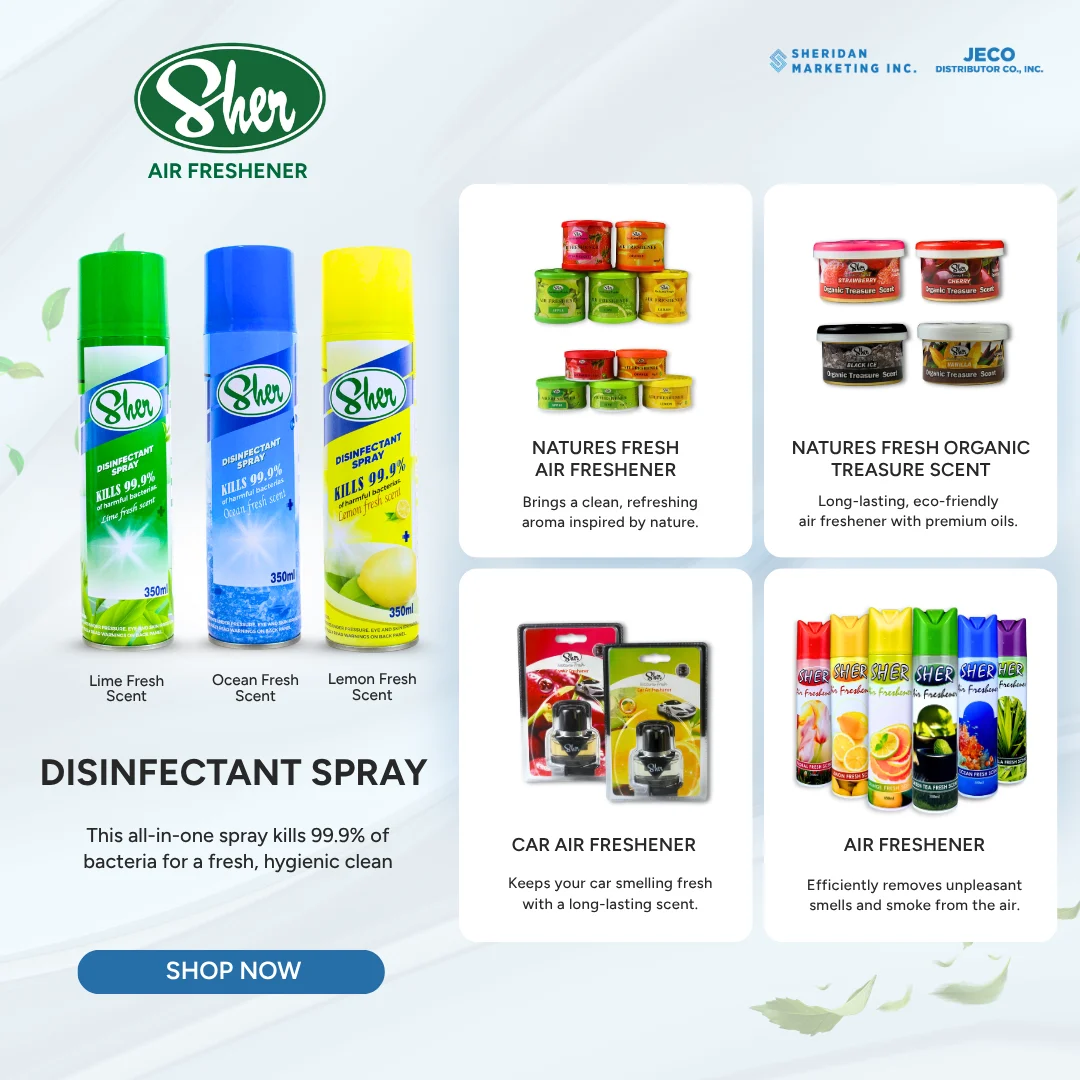 SHER Disinfectant Spray 350ml provides powerful, all-in-one cleaning and protection, killing 99.9% of harmful bacteria, eliminating germs like Staphylococcus aureus, E. coli, and Candida, while leaving a fresh fragrance—perfect for maintaining a hygienic and healthy environment at home or in the office.